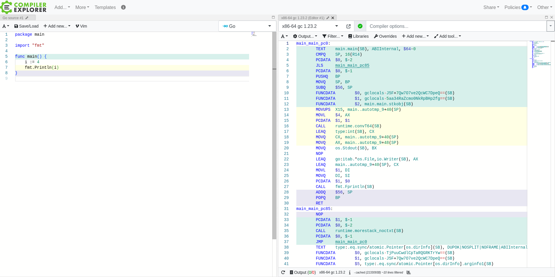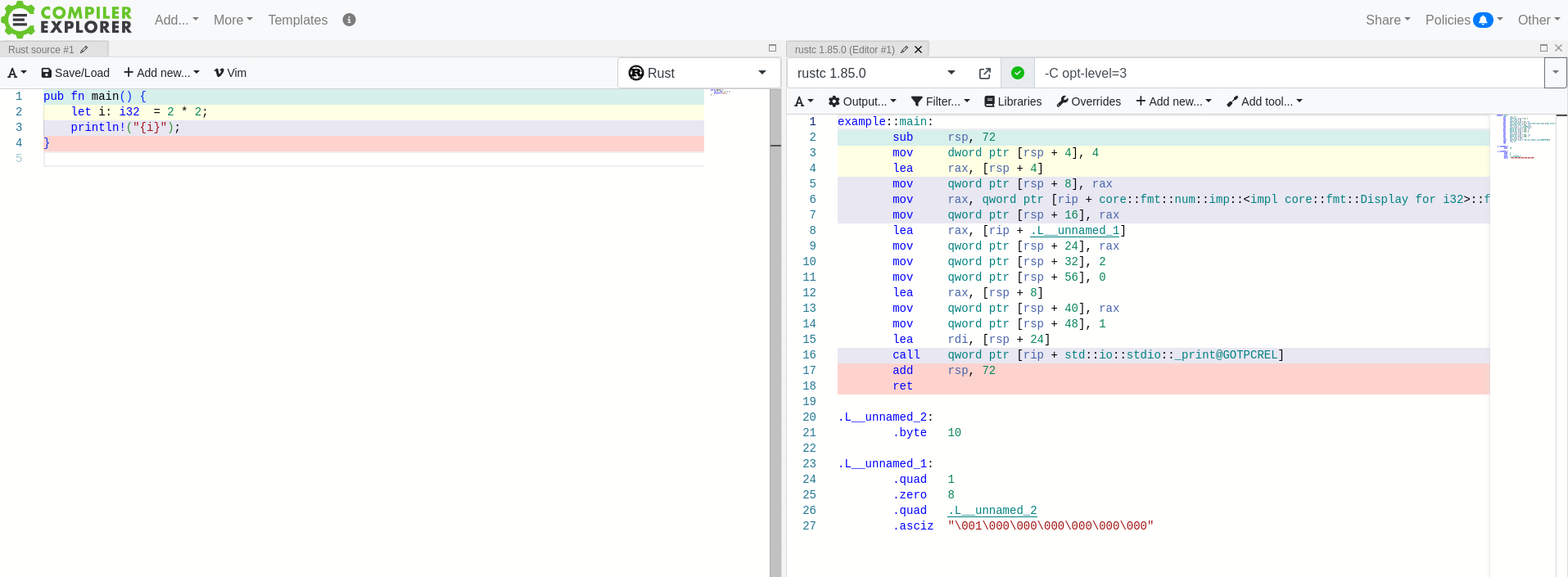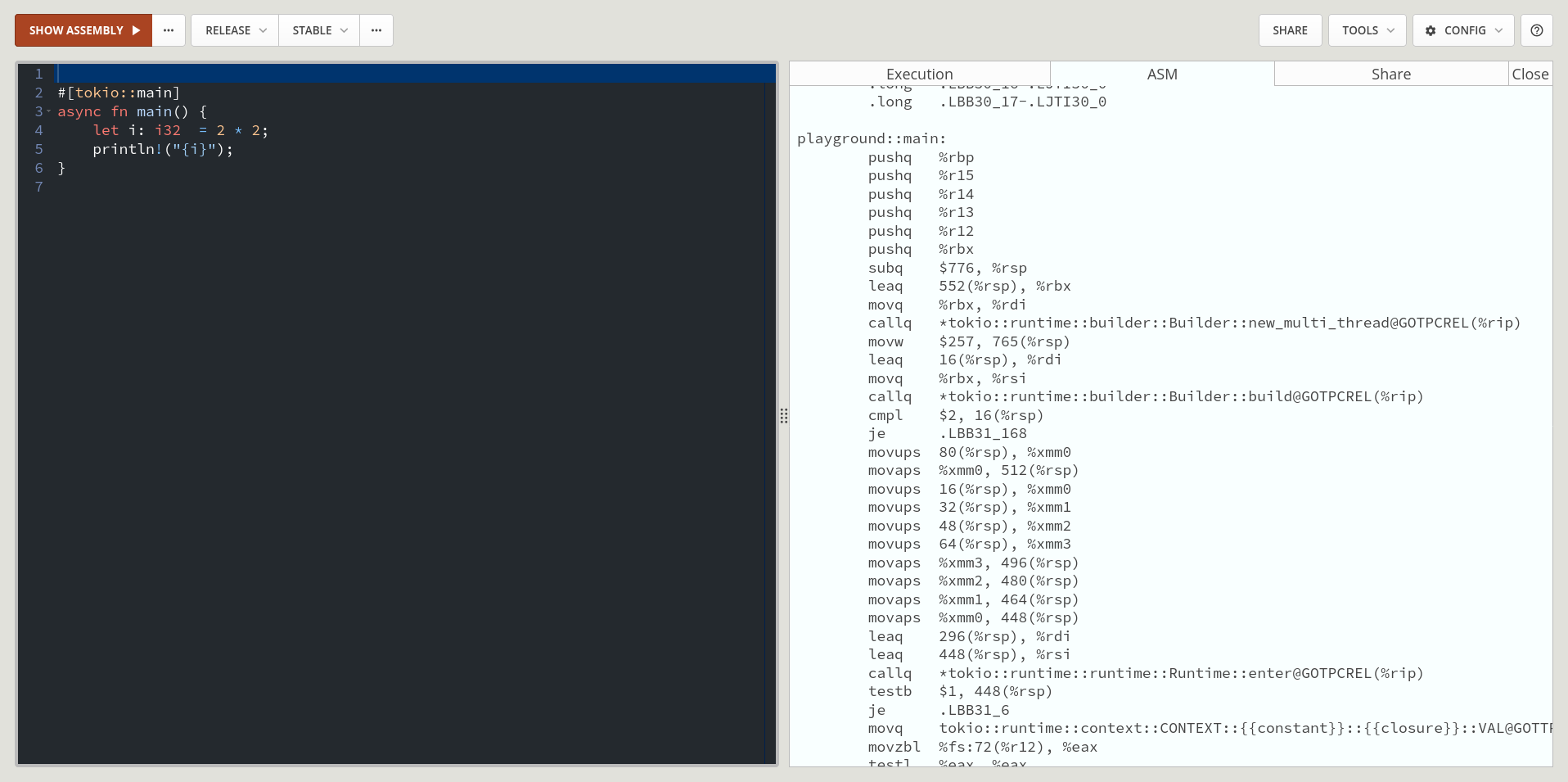 As an aside, Rust Playground is another useful website that allows you to execute visualize compiled Rust code. It is specific to Rust and contains more Rust specific functionality (like access tokio for example) than Godbolt.