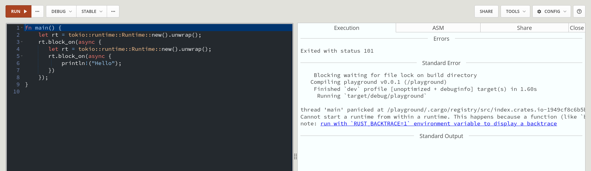 Running a runtime within a runtime is not allowed and will result in a panic. The simple reason is that the code for the runtime is synchronous blocking code. As discussed earlier, you shouldn’t run synchronous blocking code in an asynchronous context or you’ll starve out other tasks.